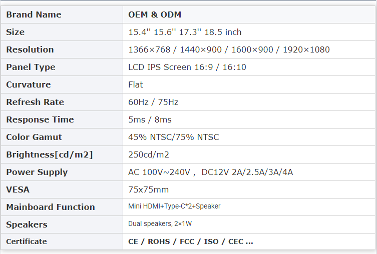PC Monitor 12'' - 20'' 16:9