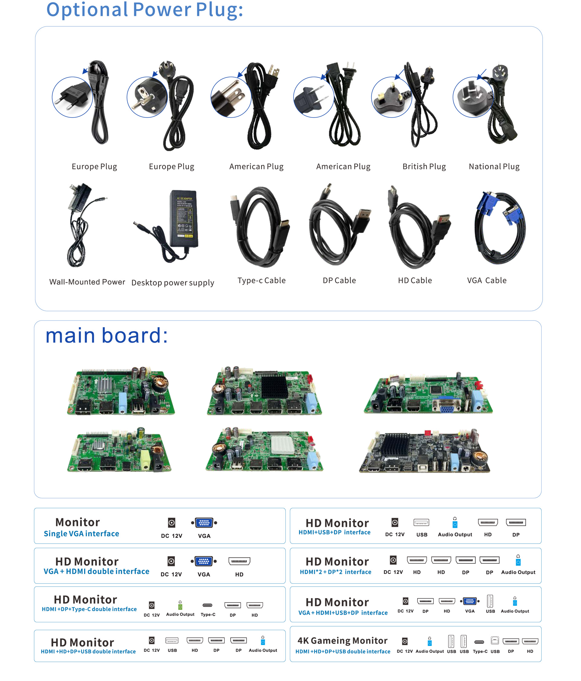 DP+HDMI+VGA+USB+Audio Out+DC 12V |